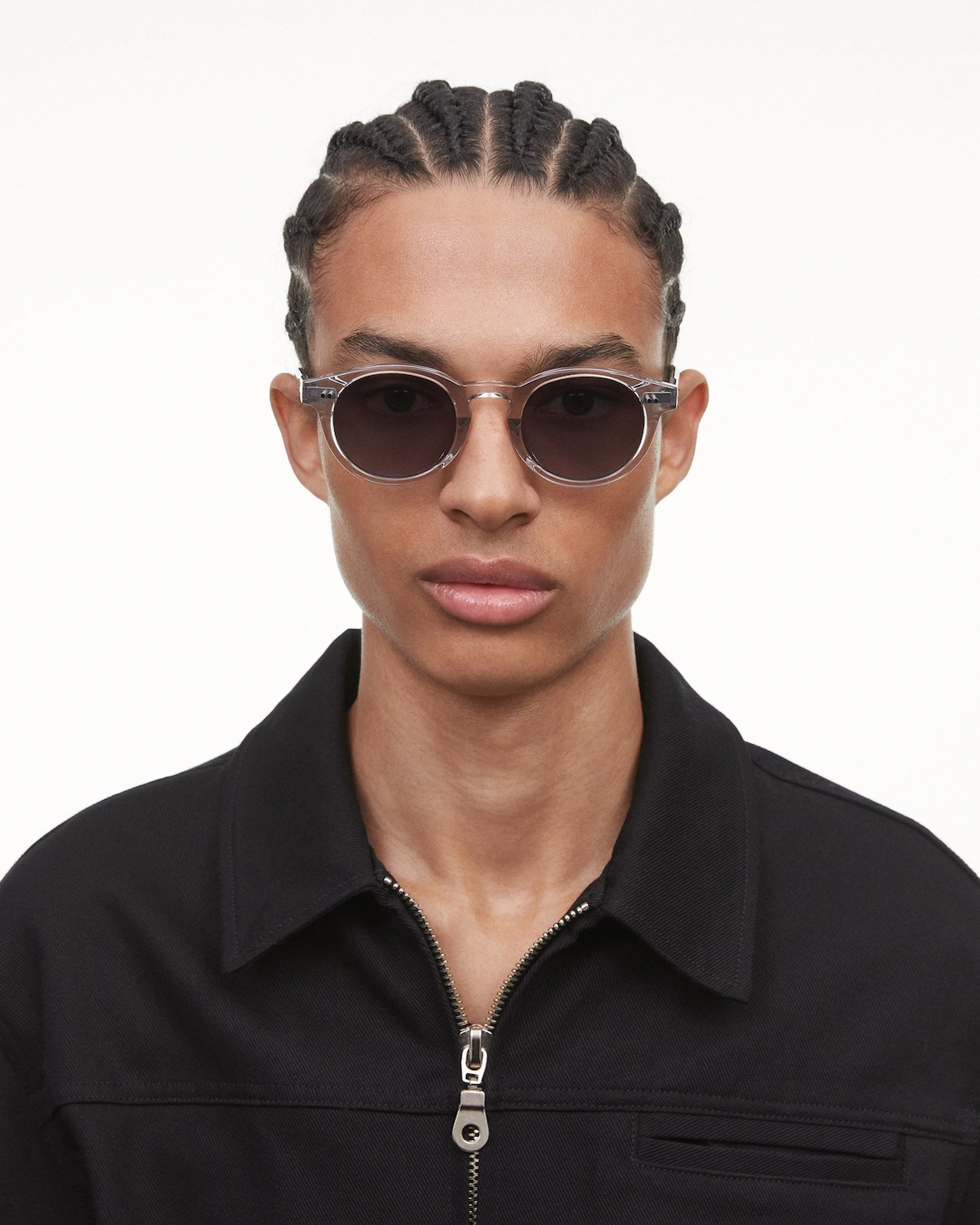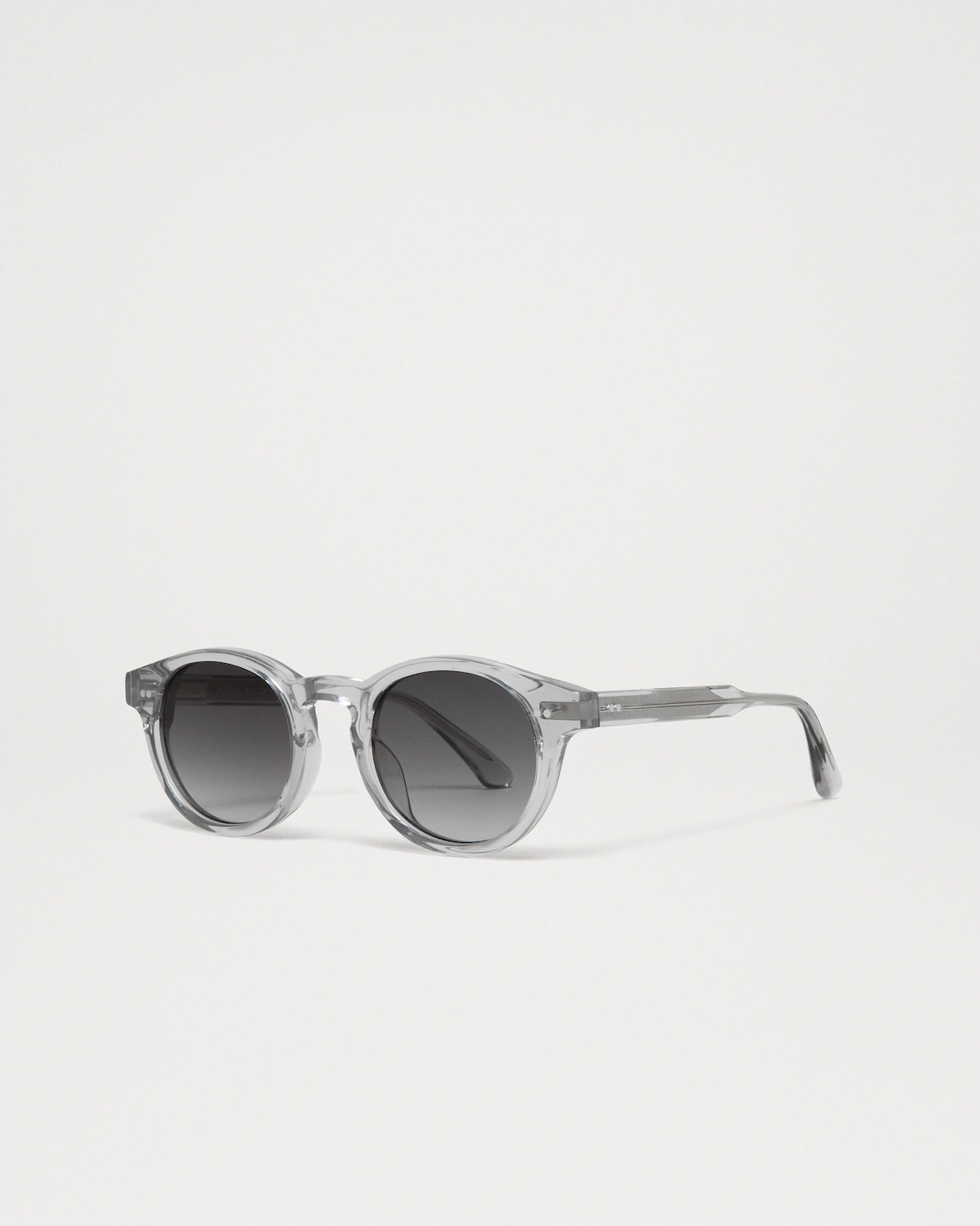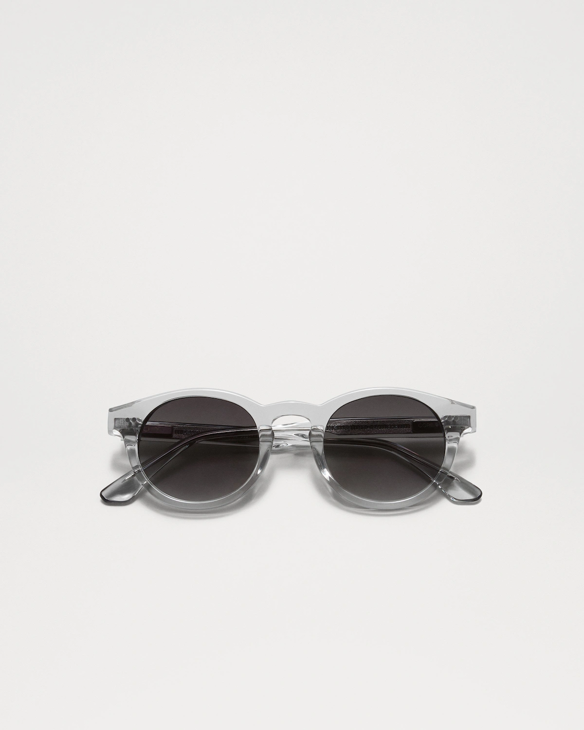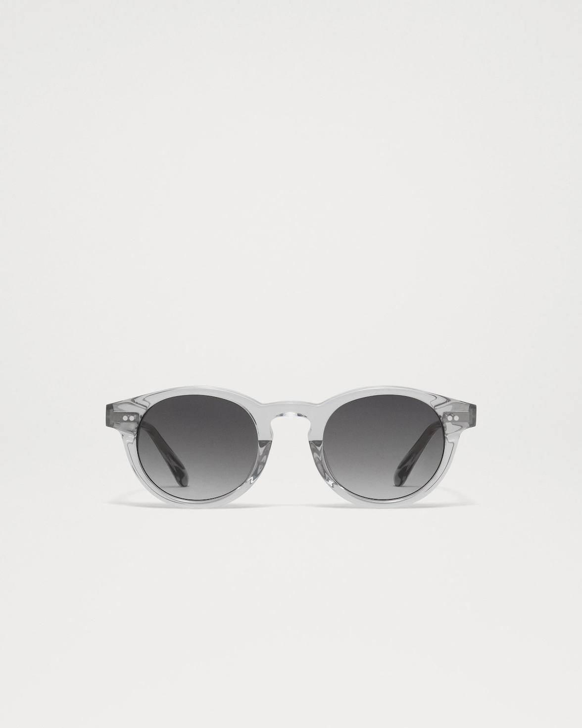 Occhiali da sole pantos Chimi, eleganti classici di ispirazione vintage. La montatura ovale color grigio trasparente è impreziosita da cerniere con rivetti color argento. Lenti sfumate color grigio, con protezione al 100% da UVA+UVB.