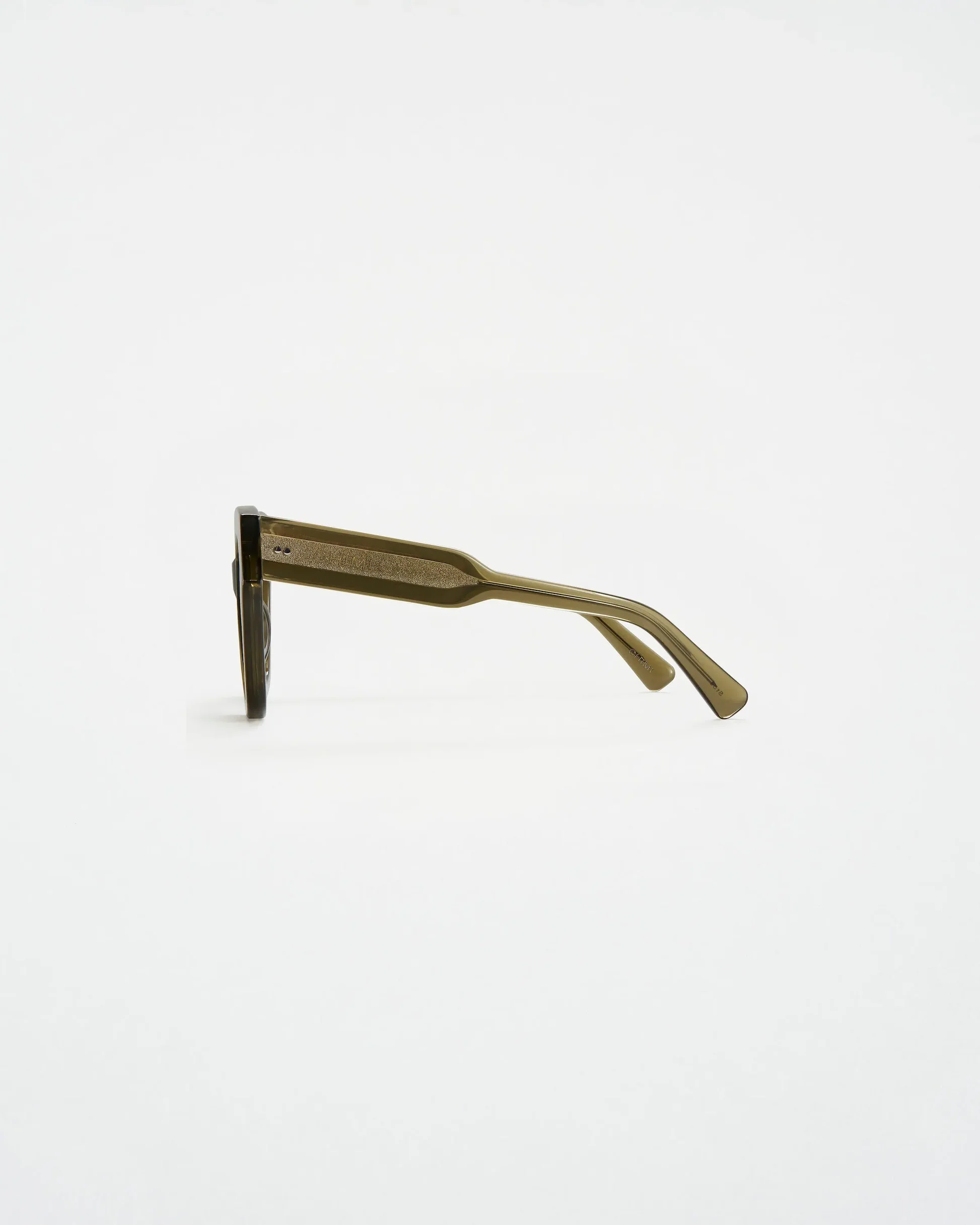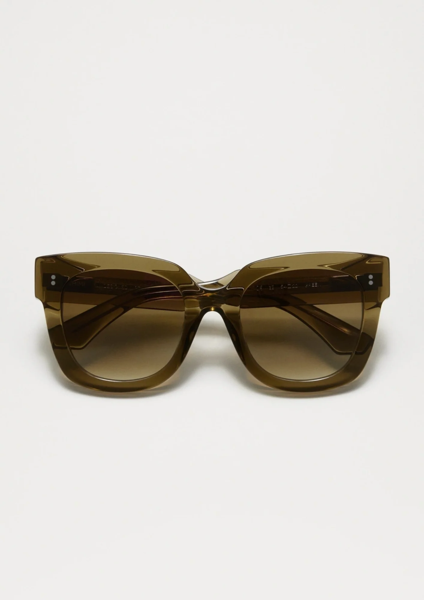 Occhiali da sole ultra-bold Chimi, dalla forma a farfalla senza tempo, dimensioni oversize e spessori esagerati. Realizzati a mano in acetato regolabile color verde oliva trasparente. Lenti sfumate color verde, con protezione al 100% da UVA+UVB.