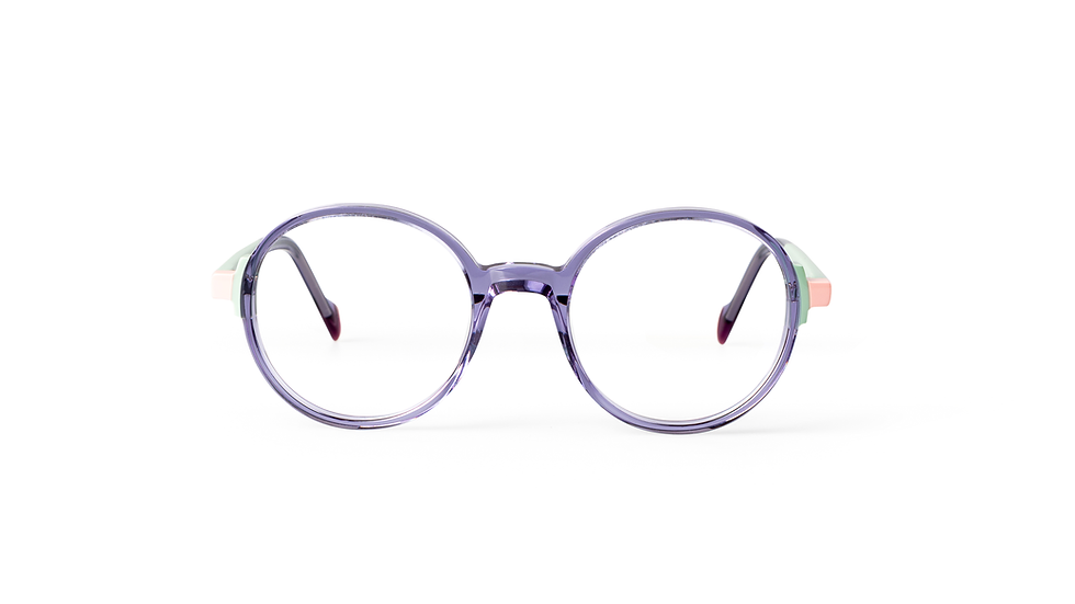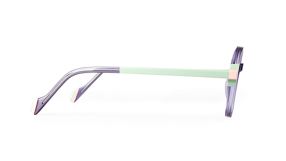 Occhiali da vista in acetato color lavanda chiaro. Occhiale femminile, dalla forma panto rivisitata in stile moderno, con aste verde menta chiaro e piccoli dettagli rosa.