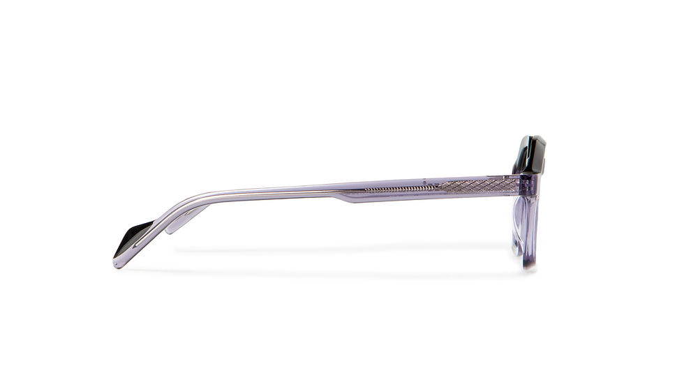 Occhiali da vista in eco-acetato e titanio, color grigio traslucido. Occhiale unisex, dalla linea solida, bold e dalla forma esagonale, con dettagli superiori neri.