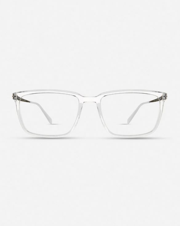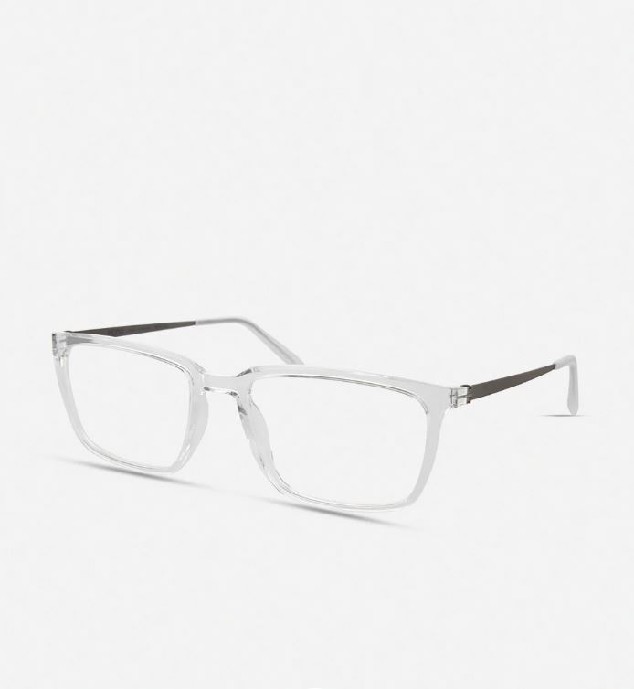 Occhiali da vista in acetato trasparente e astre in titanio grigio sottile e leggero, dalla forma squadrata .