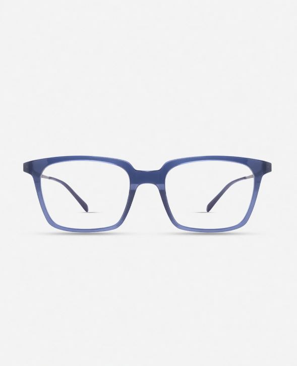 Occhiali da vista in acetato blu o, dalla forma squadrata con aste in titanio grigio.