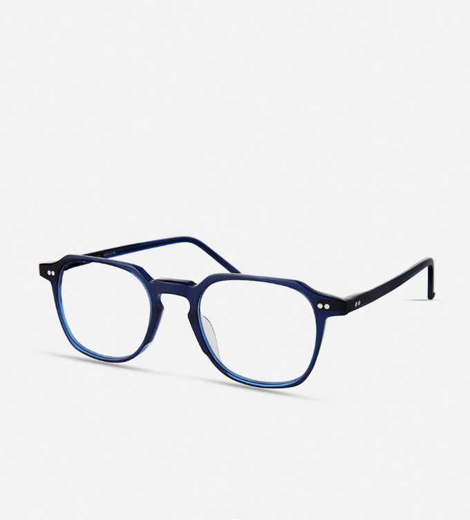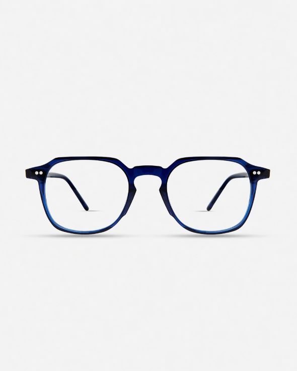 Occhiali da vista in acetato color blu, dalla forma squadrata.