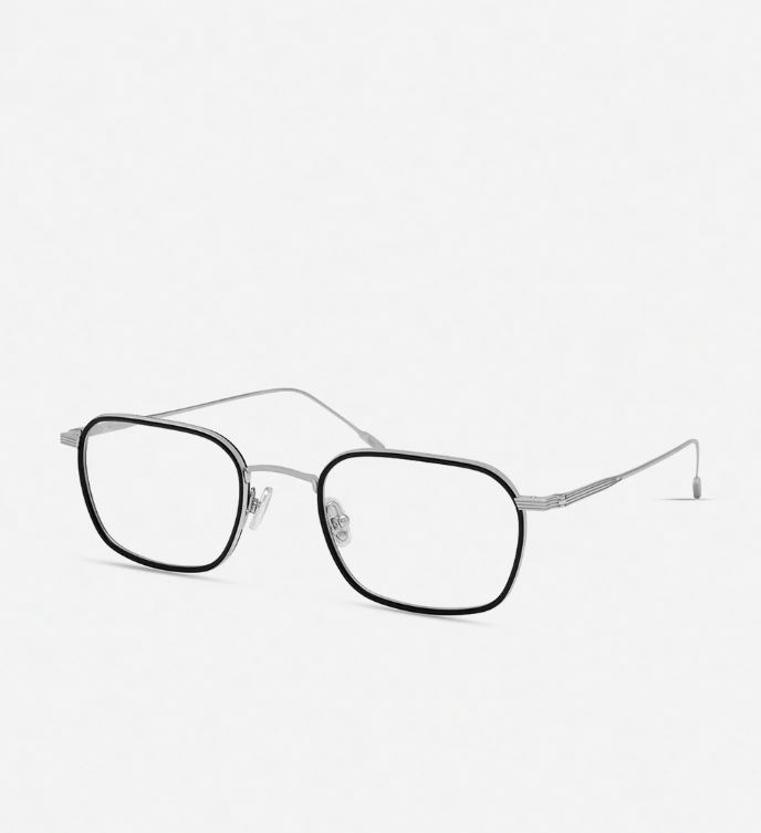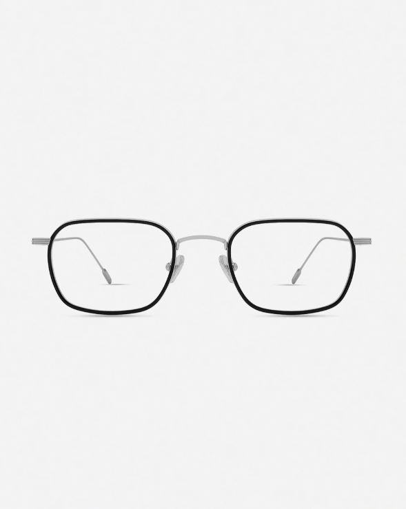 Occhiali da vista in titanio grigio e nero, dalla forma squadrata con aste in titanio grigie.