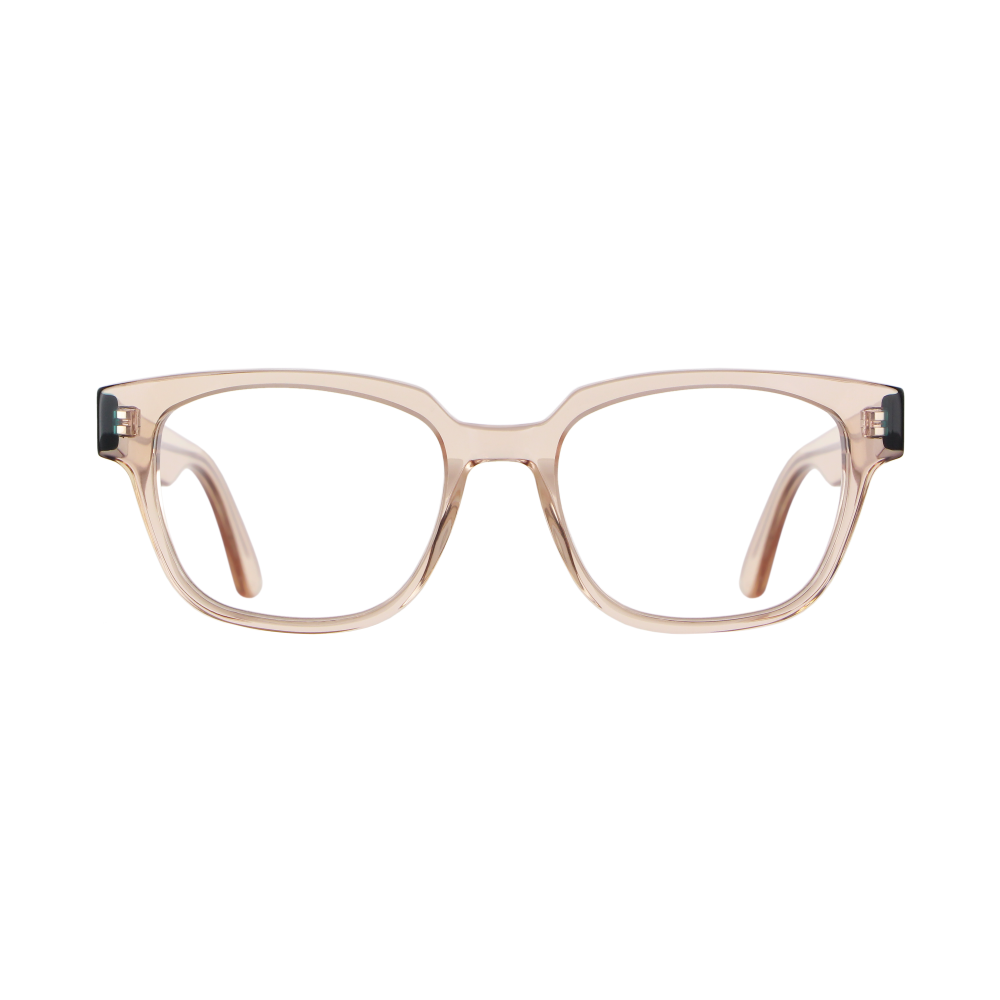 Occhiali da vista in acetato, color rosa pescato trasparente , leggerissimo e delicato, e dettaglio ottanio. Raffinatezza e gusto con un tocco in più.