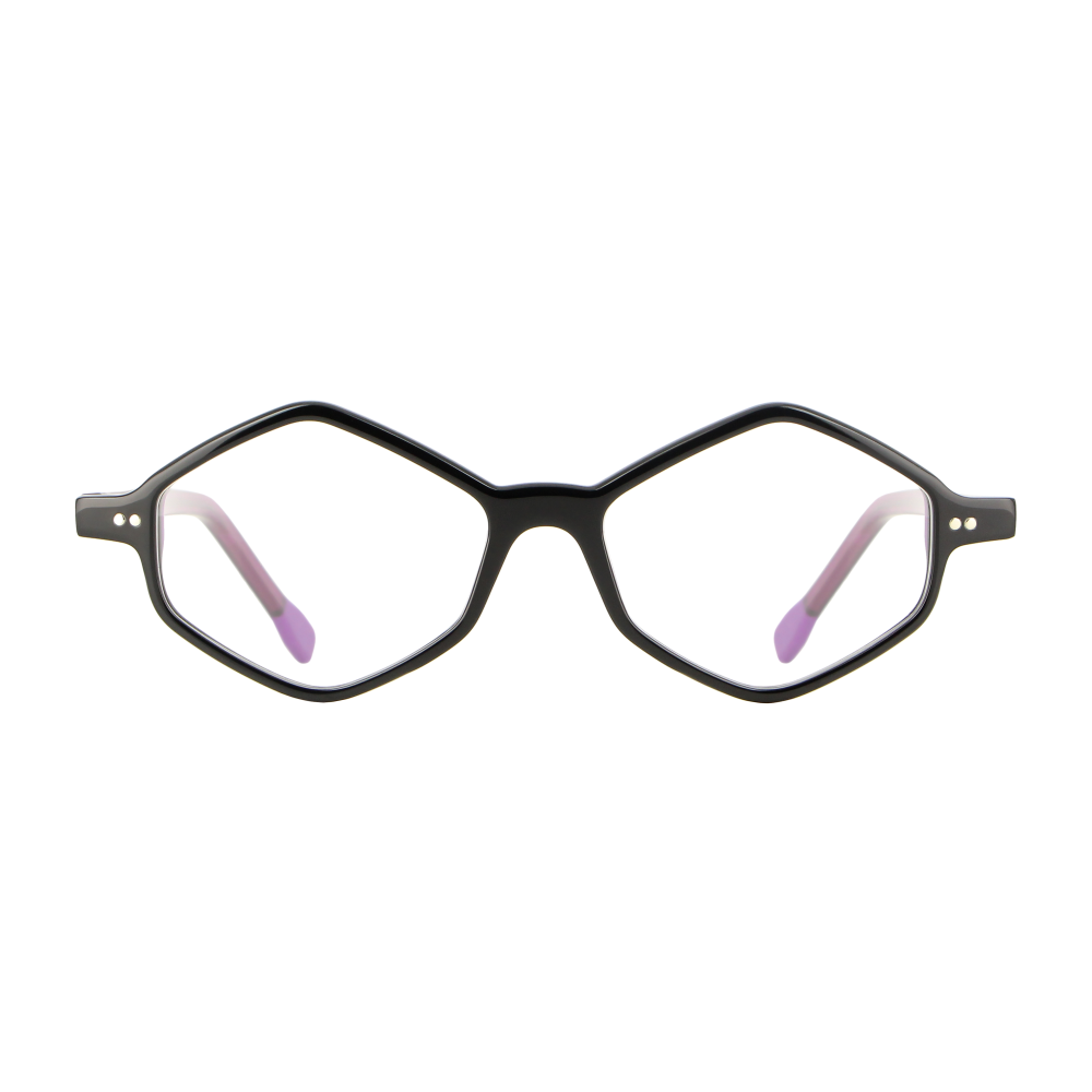 Occhiali da vista in acetato, color nero e violetto dalla forma romboidale. La sintesi dell'eleganza risultato di un processo di produzione meticoloso, in cui vengono fresati gli eccessi, per donare morbidezza, rotondità e una sensazione estremamente liscia al tatto.