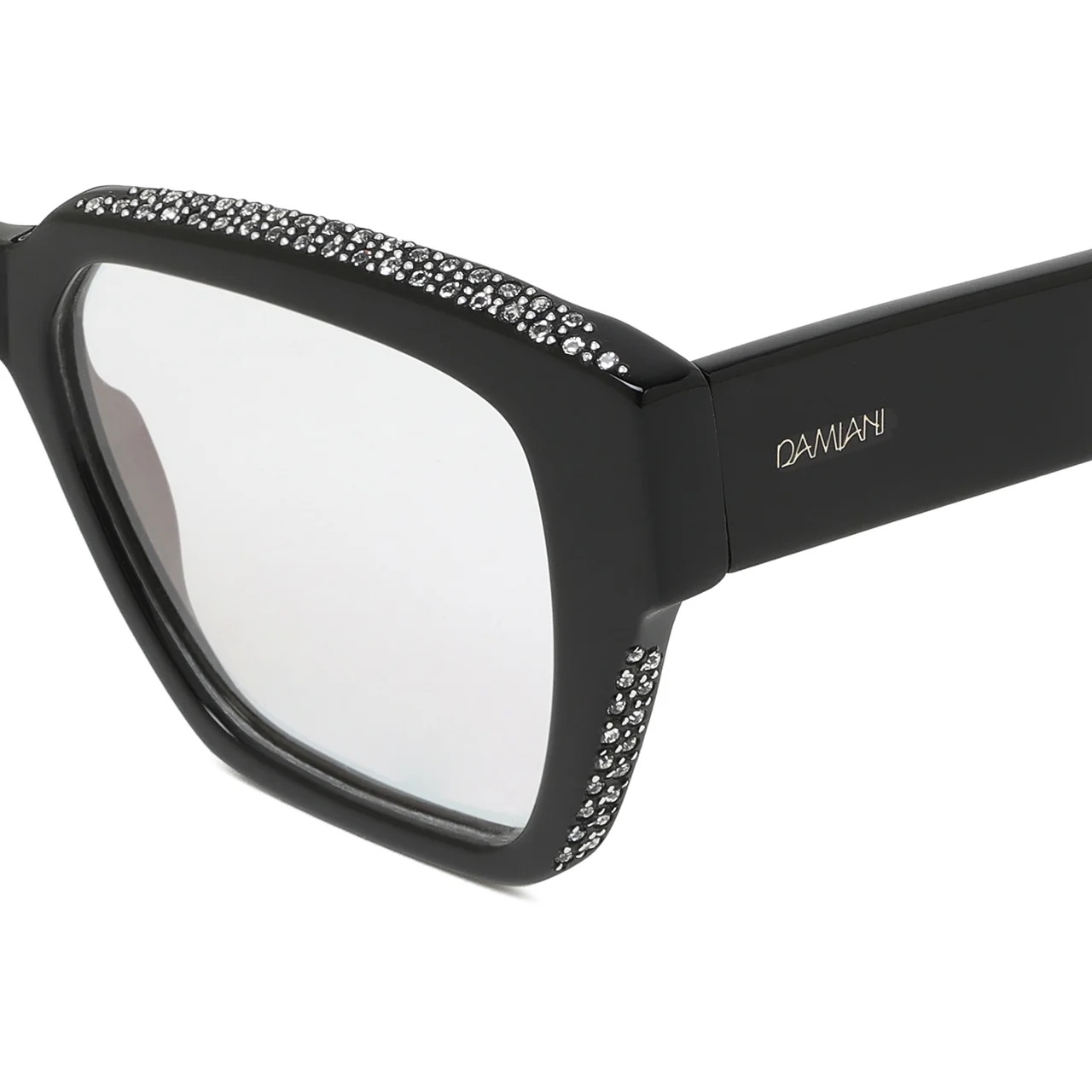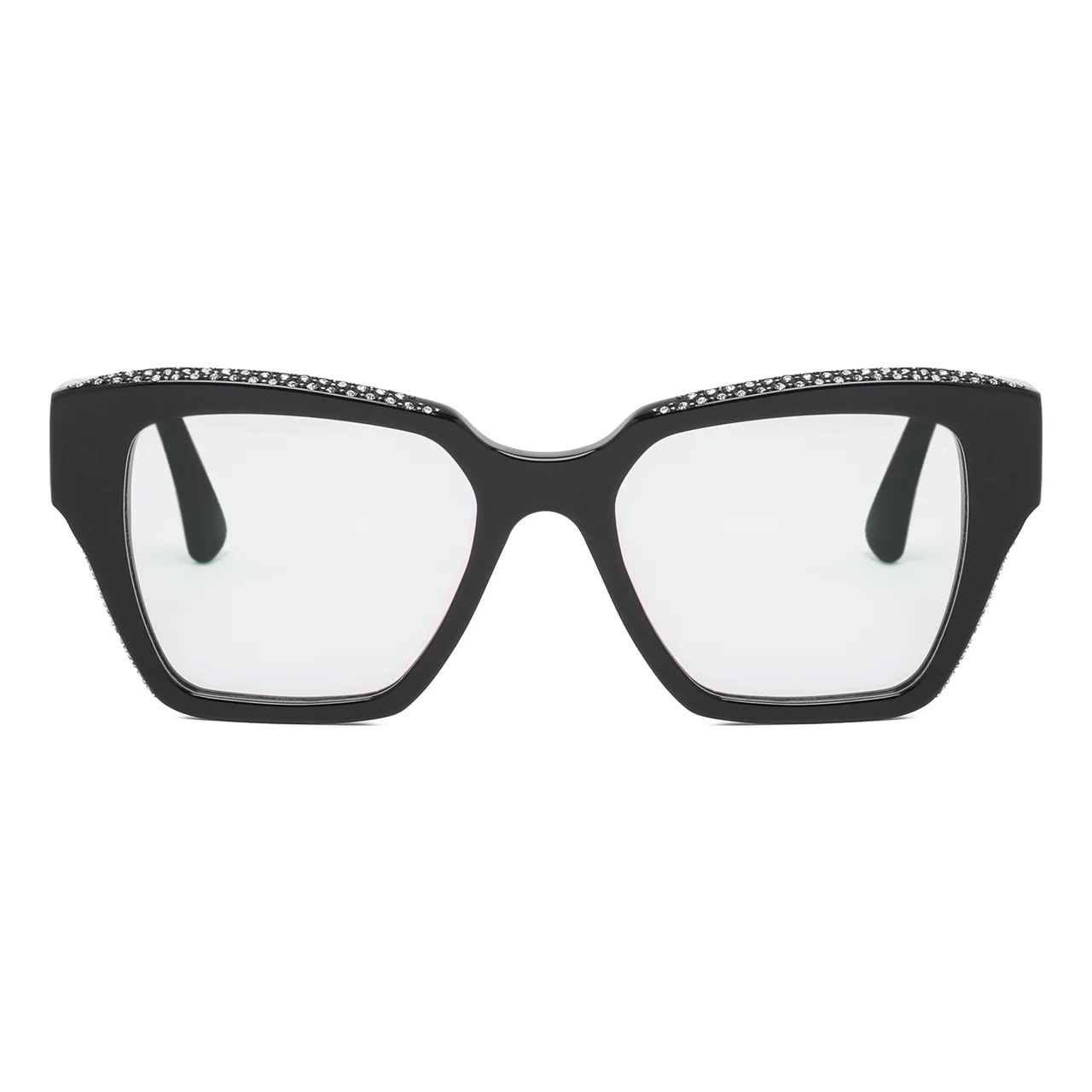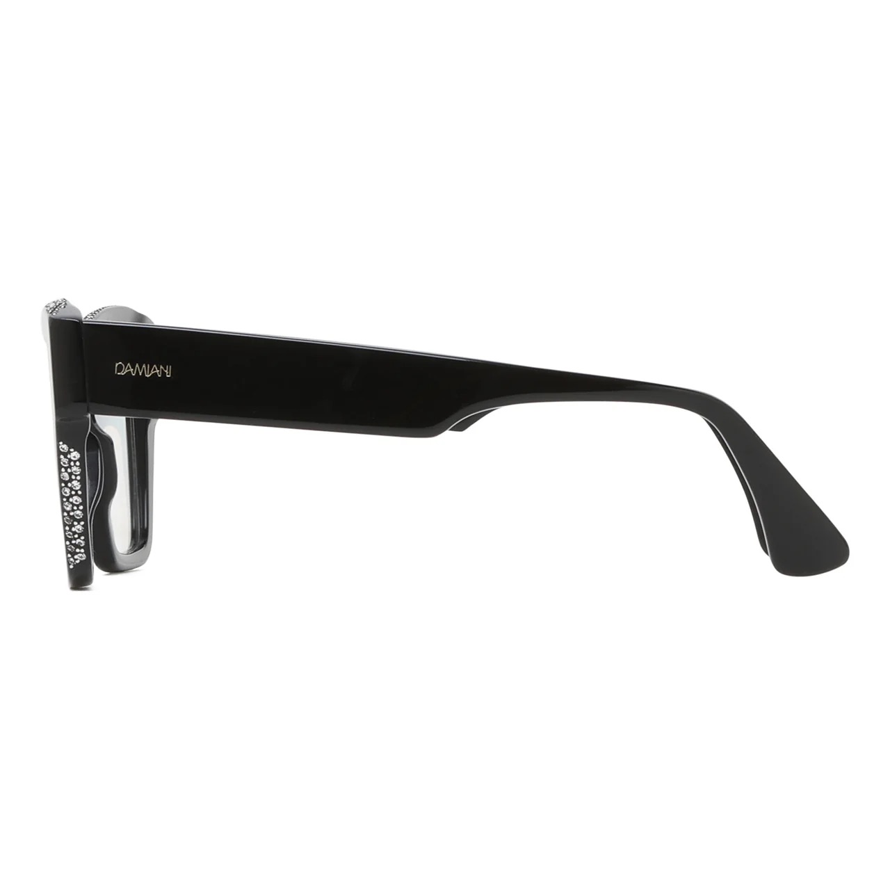 Occhiali da vista rettangolari, in acetato, color nero con gemme. La forma unica, angolare e voluminosa, esprime magnificamente l'essenza della femminilità. Preziose gemme, posizionate a mano, sul ciliare e sui lati esaltano e illuminano lo sguardo.