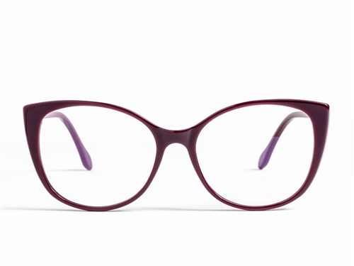 Occhiali da vista in acetato viola, solido, color succo d'uva, dalle forme morbide e dal cat-eye marcato.