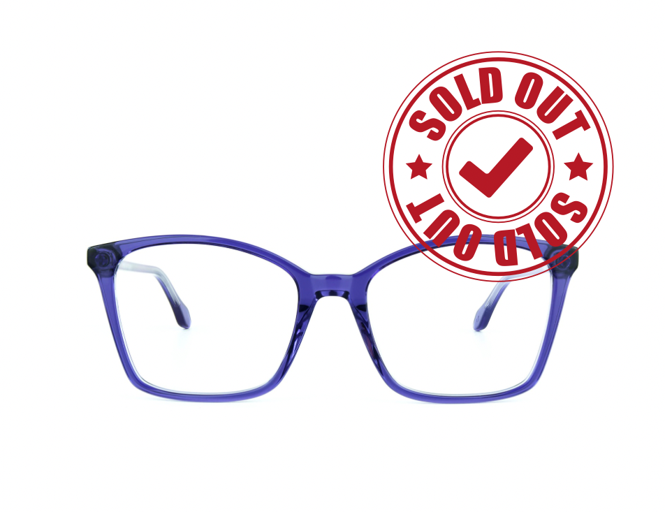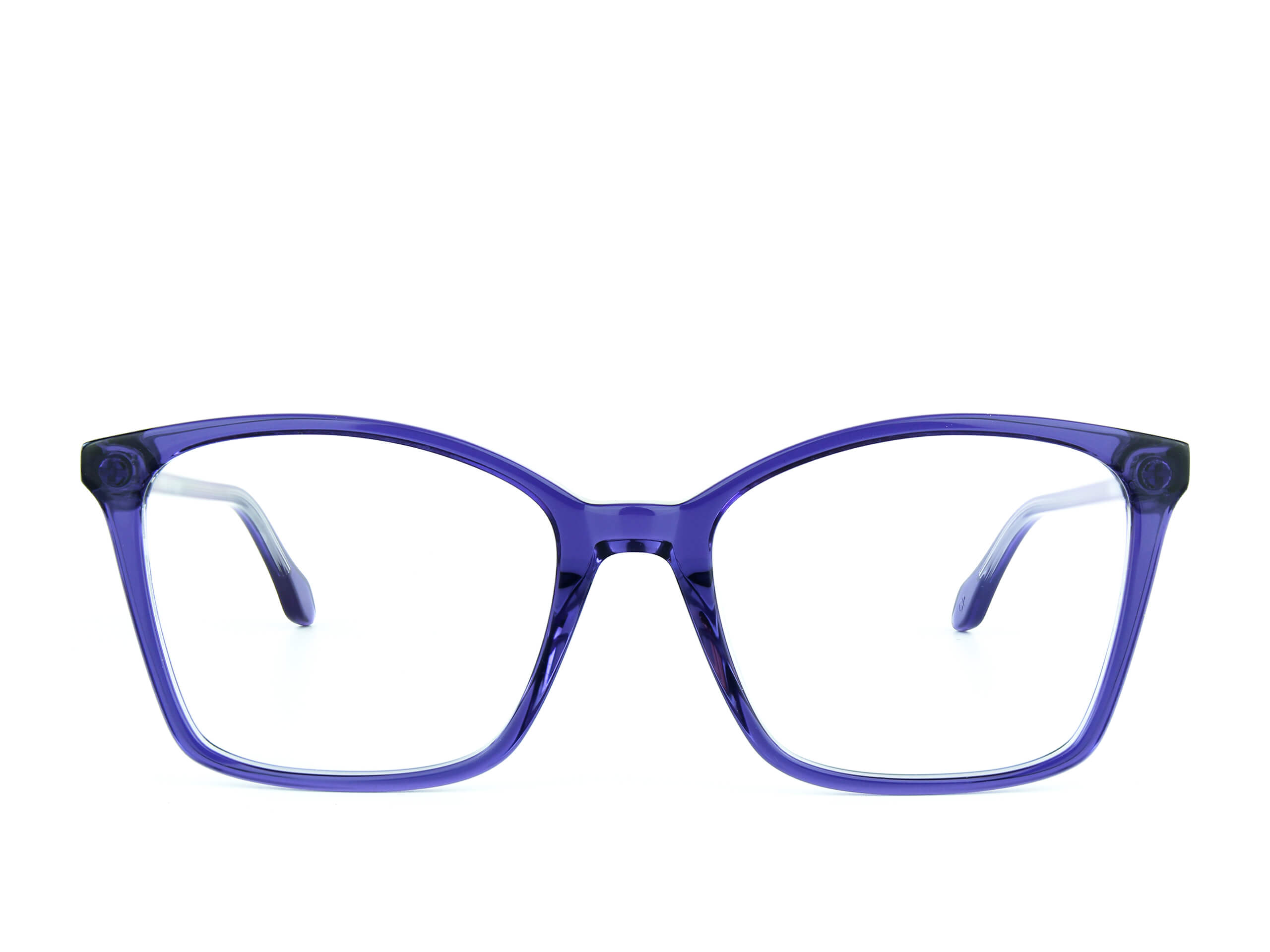 Occhiali da vista in acetato viola eccentrico, traslucido dalla forma geometrica a farfalla.