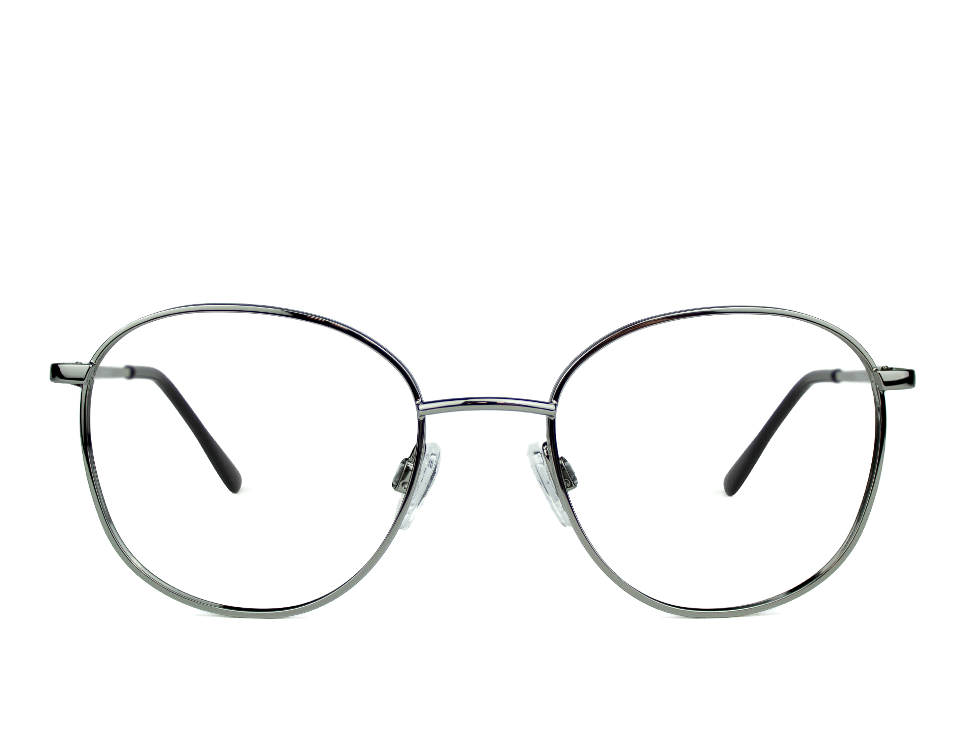 Occhiali da vista in metallo color grigio canna di fucile, smaltato galvanizzato, dalla forma pantoscopica.