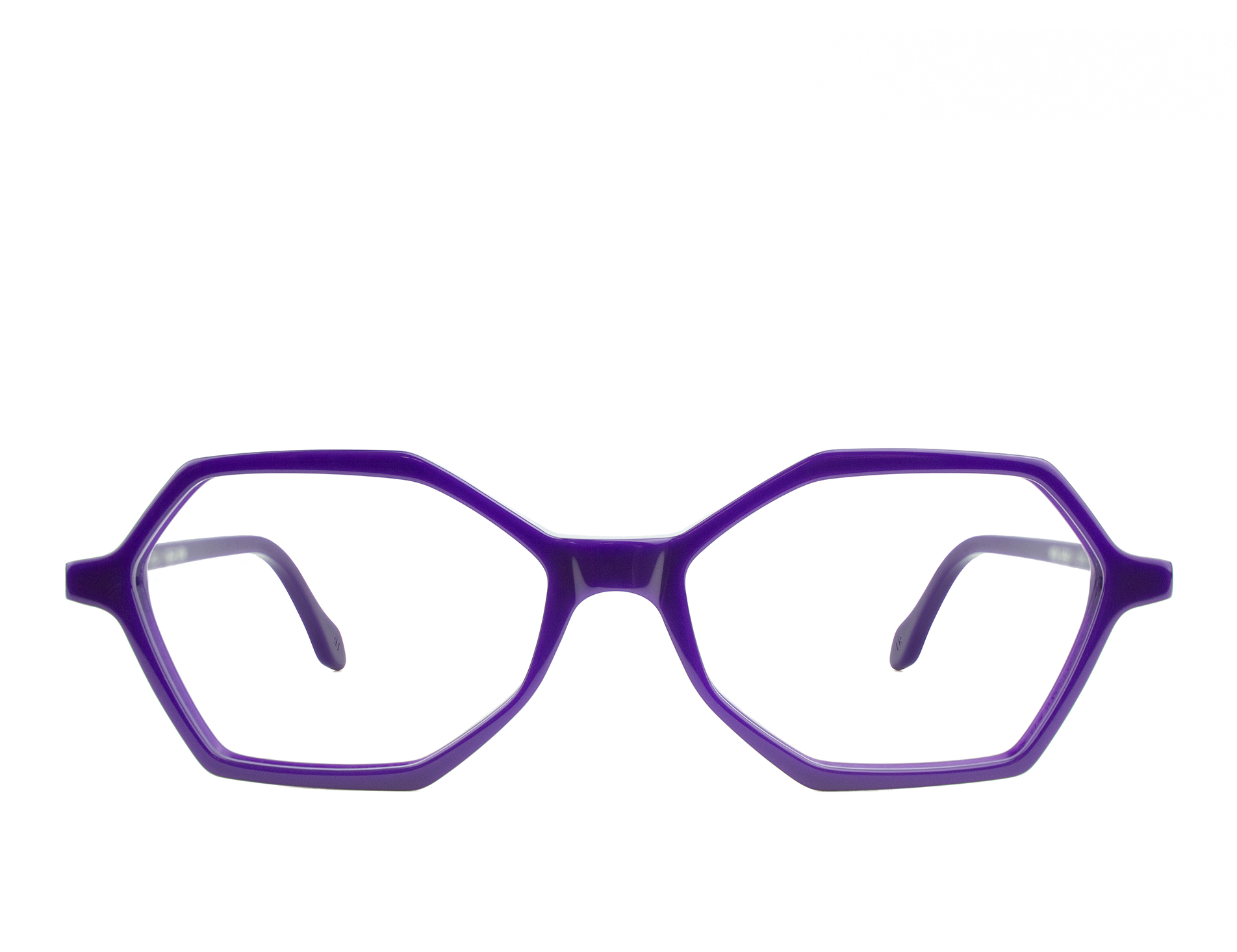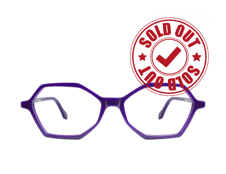 Occhiali da vista in acetato viola dalla forma innovativa e multisfaccettata.