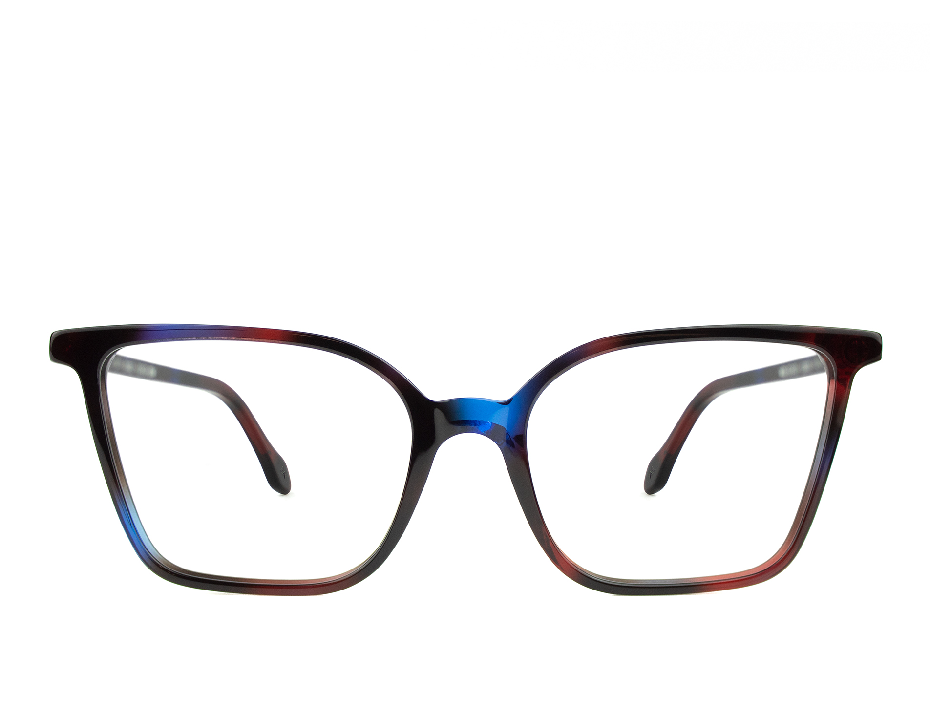 Occhiali da vista squadrati, allungati in acetato tartarugato rosso e blu.