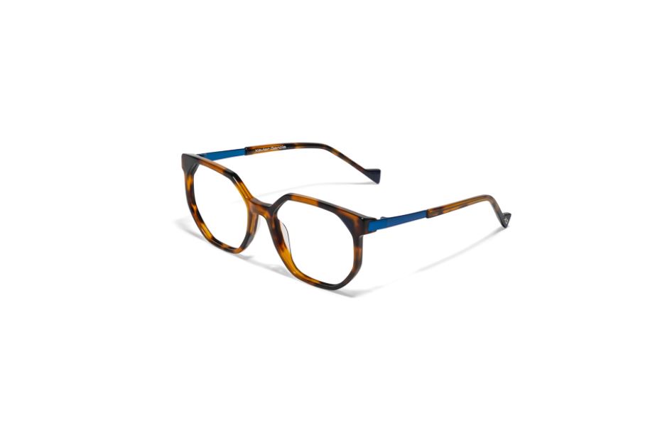 Questi occhiali da vista di Xavier Garcia Barcelona, modello Forma, sono di colore havana sul frontale con aste, in materiale combinato acetato e metallo, di colore havana e blu.